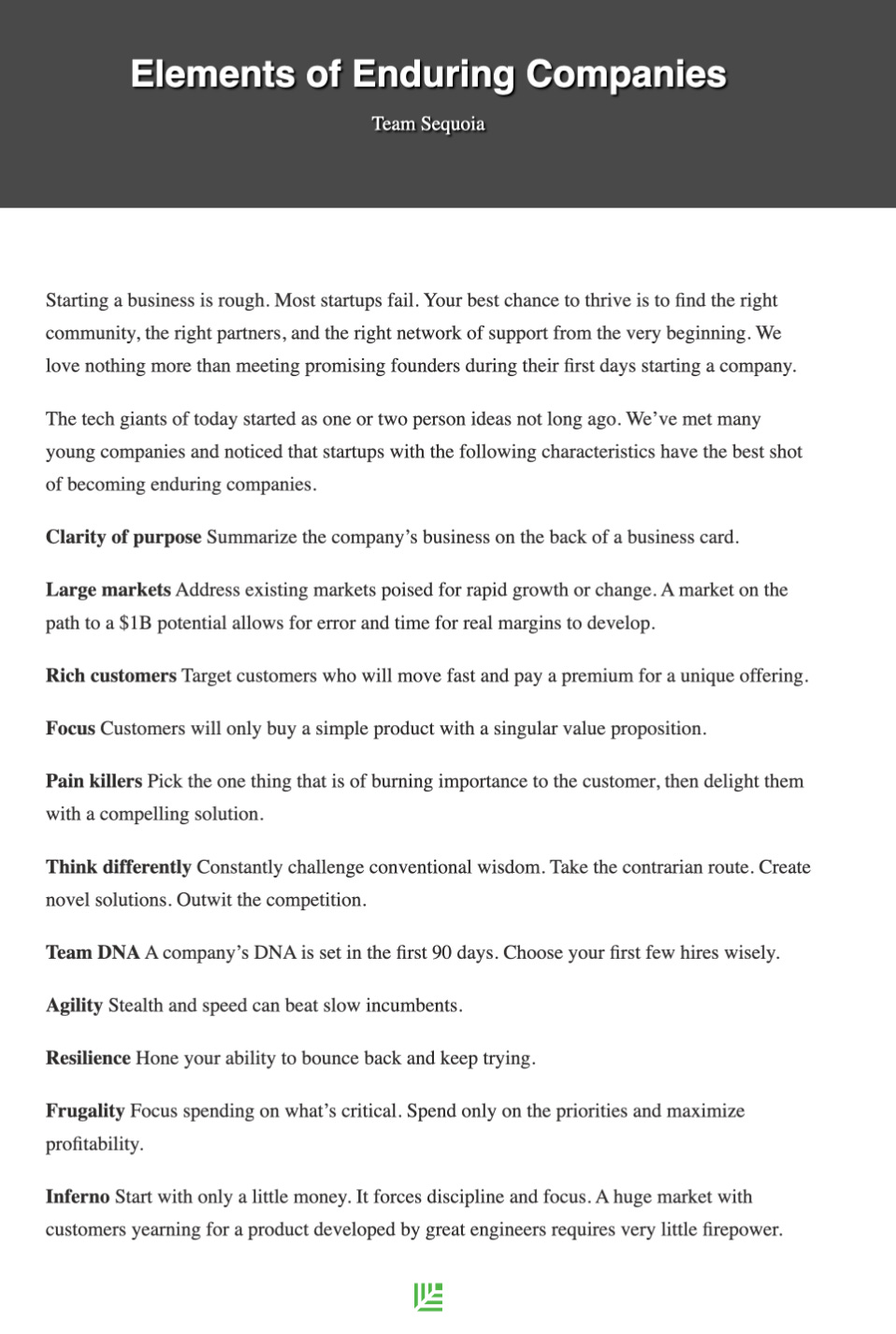 Sequoia Capital has this little-known web page I first came in contact with circa 2012 called Elements of Enduring Companies. Here's a screenshot, bc god knows if they'll delete it any day.